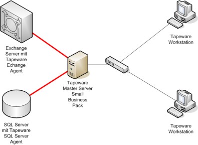 In diesem Szenario besteht das Sicherungssystem aus einem Tapeware Master Server Small Business, der ein internes Bandlaufwerk bedient. Weiterhin werden die vorhandenen Workstations im Netzwerk und natürlich die beiden Applikationsserver des MS Small Business Servers, nämlich der Exchange Server und der SQL Server, mitgesichert.