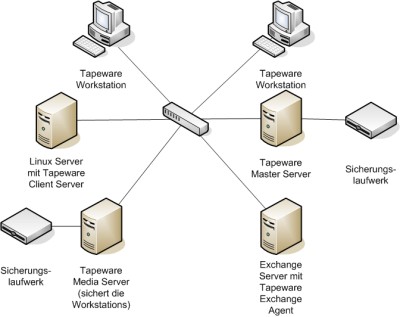 In diesem Szenario besteht das Sicherungssystem aus einem Tapeware Master Server, einem Tapeware Media Server, der ein weiteres Bandlaufwerk bedient, einem Exchange Server und einem Linux Server. Weiterhin werden die vorhandenen Workstations im Netzwerk mitgesichert.